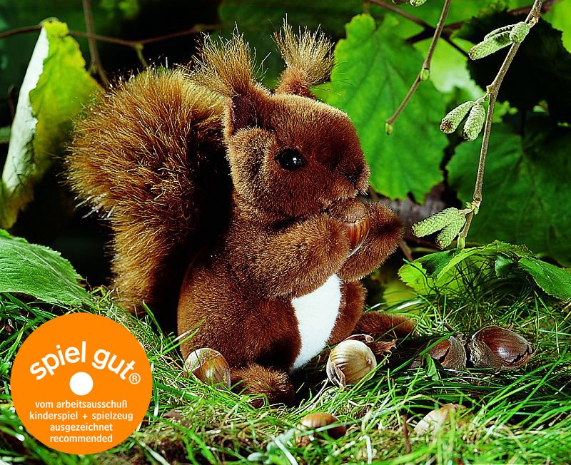 Handgearbeitetes Eichhörnchen aus Plüsch. TÜV geprüft und Waschmaschinen geeignet bis 30°.