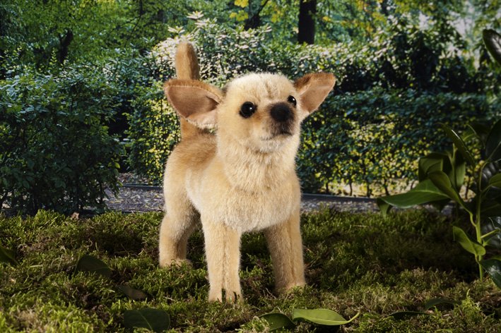 Handgearbeiteter Chihuahua aus Plüsch. TÜV geprüft und Waschmaschinen geeignet bis 30°.