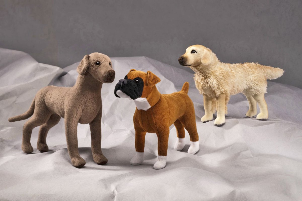 Handgearbeiteter Hund aus Plüsch. TÜV geprüft und Waschmaschinen geeignet bis 30°.