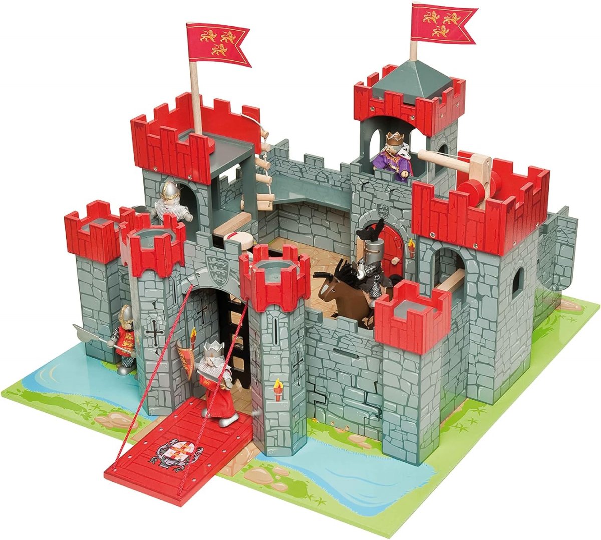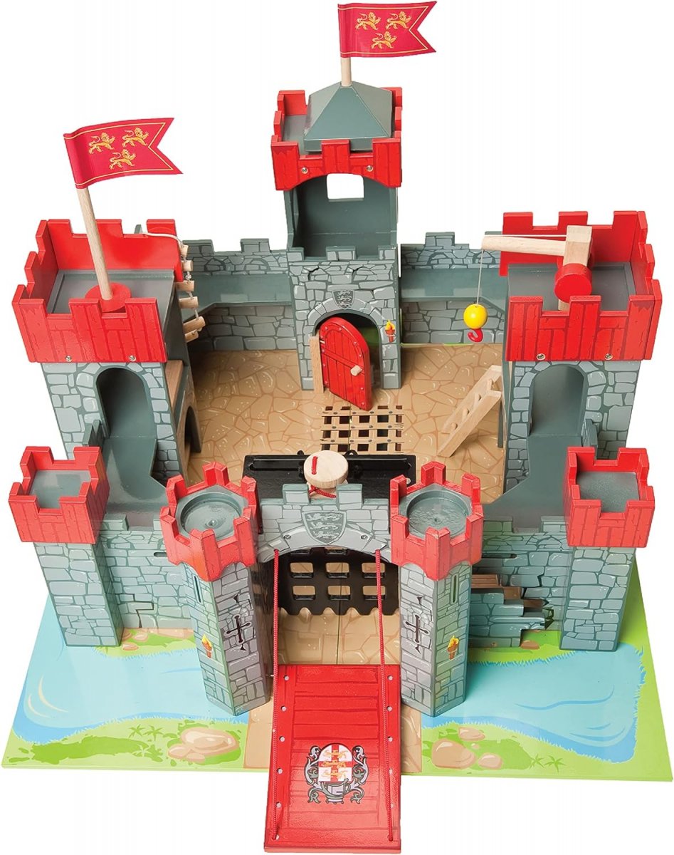 Diese prächtige Burg ist die größte in der LE TOY VAN-Reihe und verfügt über eine beeindruckende Zugbrücke, ein hochziehbares Falltor, Türme, Gefängnismauer, eine Seilwinde, eine Leiter und Flaggen.