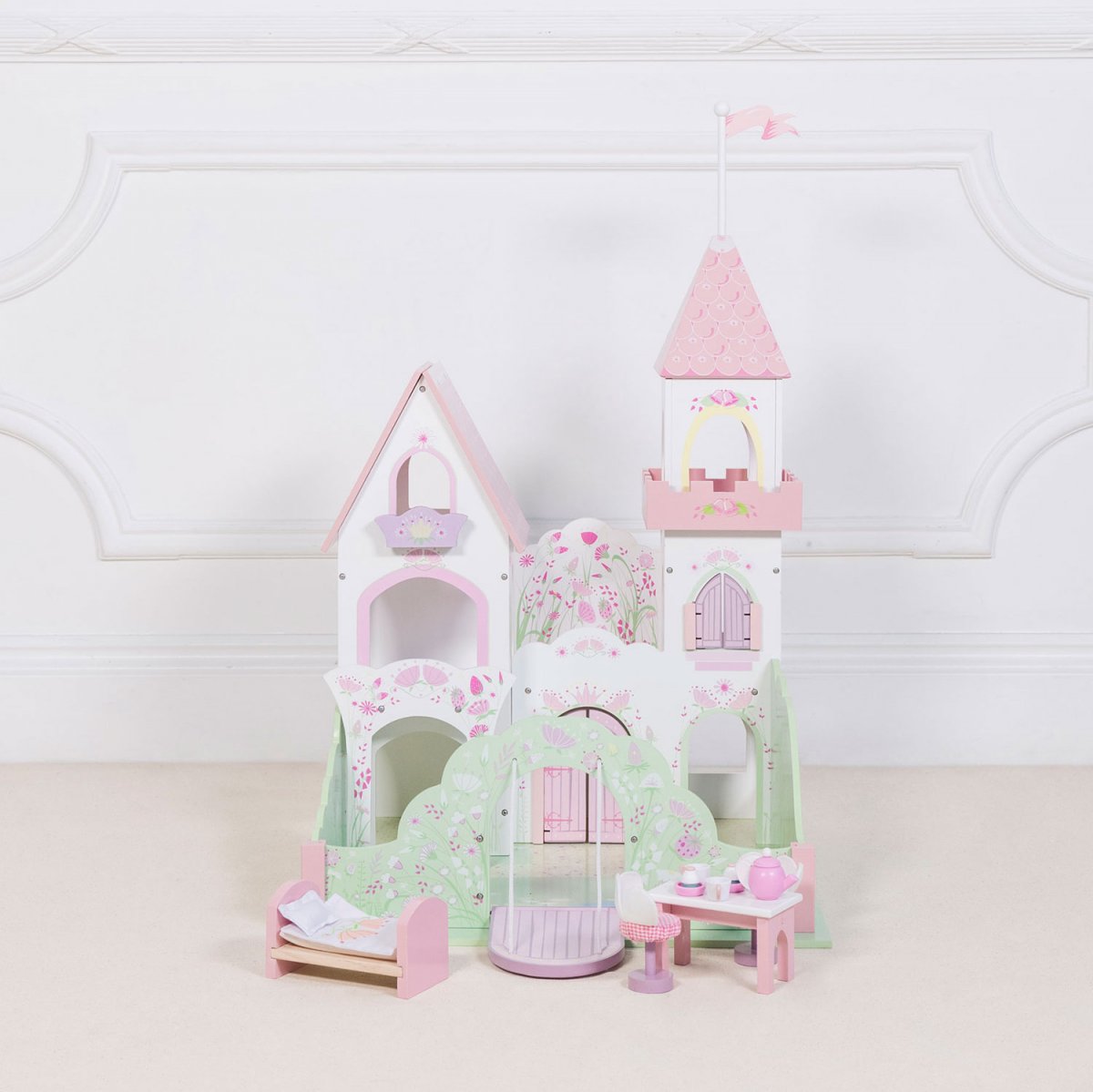 Ein zauberhaft bemaltes Märchenschloss mit detaillierter Blumenbemalung. Das Schloss besitzt einen hohen Turm mit Fahne, ein Prinzessinnenbalkon, eine Zugbrücke und aufklappbare Fensterläden und Türen.
