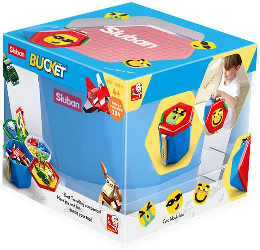 Mit dem neuen Spieleimer von Sluban kann jetzt auch unterwegs problemlos gebaut und gespielt werden. Im Eimer sind insgesamt 334 Teile enthalten mit denen die Kinder beliebig bauen und stecken können. Als Hilfe beim Bauen besteht der Spieleimer aus einem dreiteiligen, ausklappbaren Deckel in dem kleine Grundflächenplatten befestigt werden können, damit das Gebaute sicher hält und auch nichts verloren geht. Die Sluban Bausteine sind voll kompatibel zu anderen gängigen Konstruktionsbausteinen anderer Hersteller.